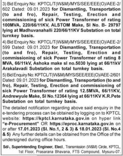 Tender for Repair, Testing, Erection and commissioning of sick Power Transformer of rating 100MVA, 220/66/11KV, ALSTOM Make, SI No. B- 29797 lying at Madhuvanahalli 220/66/11KV Substation on total turnkey basis.