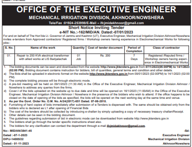 Tender for Repair to 250 KVA electrical transformer with allied works at LIS Badylachak