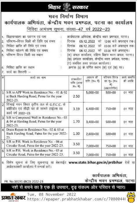 Tender for Repair to Out House, Garrage & Staff Qtr. of Residence No. 18 A at Harding Road, Patna for the year 2022-23.
