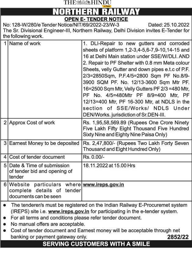 Repair to PF Shelter with 0.8 mm Meta colour Sheets, velly Gutter and down pipes e.t.c of P.F. 2/3=2850Sqm, P.F.4/5=2800 Sqm PF No.8/9- 3900 SQM PF. No. 12/13-3600 Sqm Mtr PF. 16=2500 Sqm Mtr, Velly Gutters PF 2/3 =480 Mtr, PF No. 4/5=480Mtr PF 8/9=400 Mtr, PF 12/13=400 Mtr, PF 16-300 Mtr, at NDLS in the