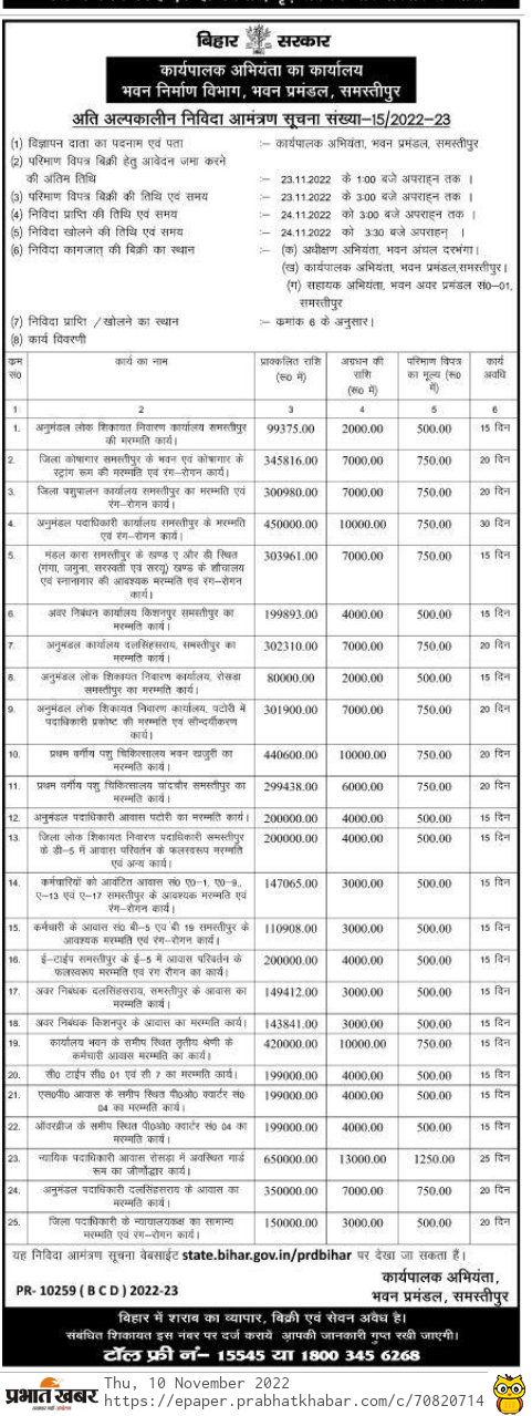 Tender for Repair work of First Class Veterinary Hospital Chandveer Samastipur