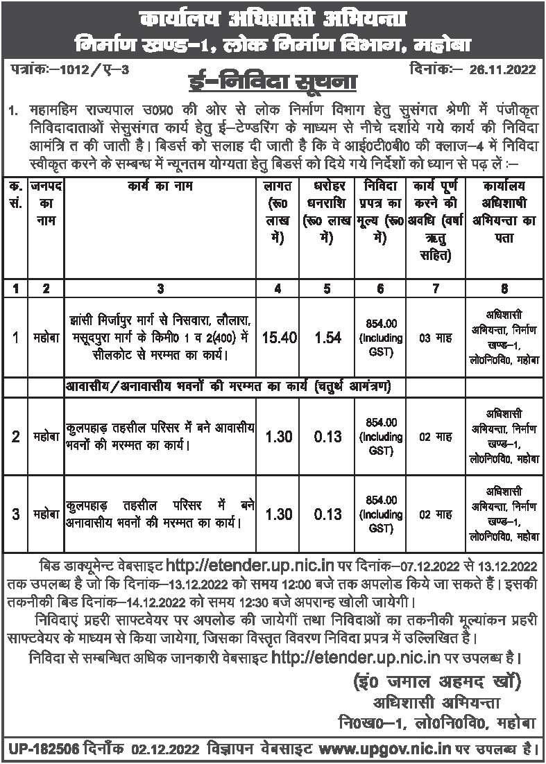 Tender for Repair work of residential buildings built in Kulpahar Tehsil premises