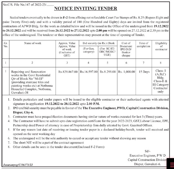 Repairing and Renovation works in the Govt Residential Qtr of Block No “M-III” (providing staircase tiles and painting works etc) at Notboma Housefed Complex, Notboma, Guwahati-38