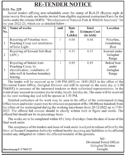 Tender for Repairing of Bokial Anti-Poaching Camp, by electrification, installation of tube well & bamboo boundary fencing