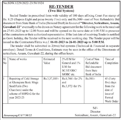 Tender for Repairing of Cold Storage at Khanapara Basic Mugn Seed Farm (Two Chambers) under the scheme of SOPD-G for the year 2022-23