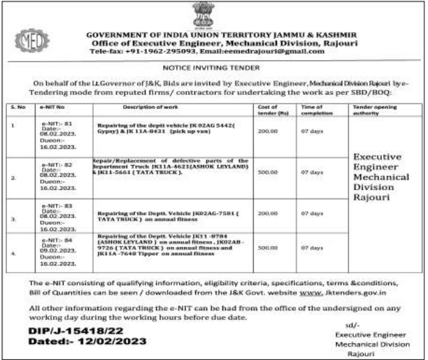 Tender for Repairing of the Deptt. Vehicle JK02AG-7501( TATA TRUCK) on annual fitness