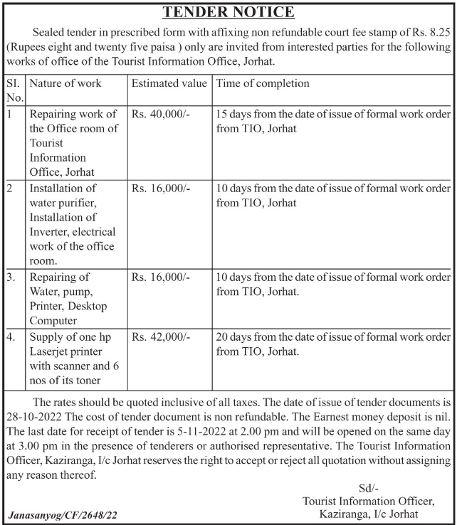 Tender for Repairing of Water, pump, Printer, Desktop Computer