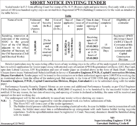 Tender for Repairing, renovation & extension of the existing SEOC in the ground floor of the CM Block adjacent to the office chamber of Secretary to the CM Secretariat (Civil and Electrical Works)