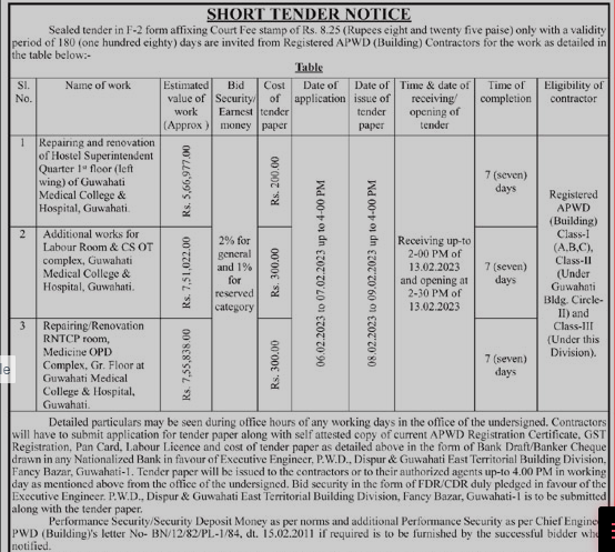 Tender for Repairing/Renovation RNTCP room, Medicine OPD Complex, Gr. Floor at Guwahati Medical College & Hospital, Guwahati.