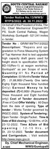 Tender for “Repairs and up- gradation to Force Measuring System of Tup Hammer And to test upgraded high capacity draft gears used for freight stock