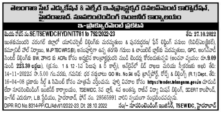 Tender for Repairs & Renovation/ Face Lifting Works (Civil/Electrical), Construction of Community Hall, MJPTBCWRS(B), Repair of Incomplete Classrooms & Toilet Block, GPC, BW for Anganwadi Center Building, ZPHS eligible for ACRs