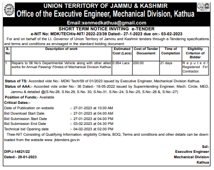 Repairs to 08 No’s Departmental Vehicle along with other allied works for Annual Passing/ Fitness of Mechanical Division Kathua