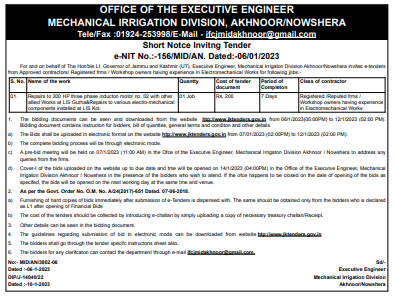 Tender for Repairs to 200 HP three phase induction motor no.02 with other 01 Job 200 Registered Reputed fr Workshop owners having experience Electromechanical Works
