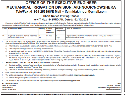 Tender for Repairs to electro-mechanical machinery installed at LIS Trooti