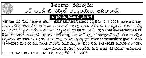 Repairs to Old Court Building, Judicial Officers’ Quarters and Staff in Court Complex at Adilabad District, Adilabad Construction of lunch room: Rs.66.24 lakhs. 2) SE/R & B /ADB/29/2022-23, Dated: 12-1-2023: Construction of Integrated District Office Complex at District Head Quarters of Adilabad District, Adilabad