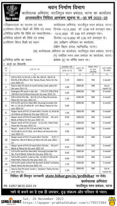 Tender for Repari work of P.H.E.D work MLC Flat No. 10,22,30,31,42,47 (Six) at R-Block at Patna for the year 2022-23