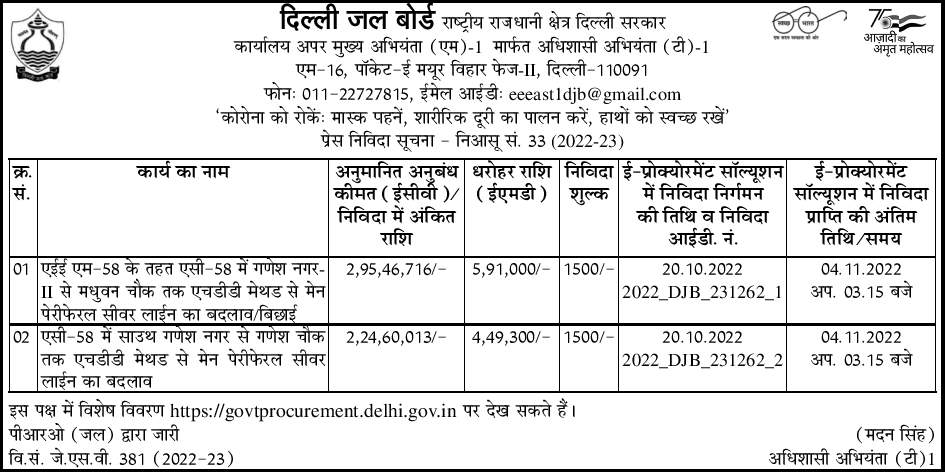 Tender for Replacement / Laying of Main Peripheral Sewer Line from Ganesh Nagar II to Madhuvan Chowk in AC-58 with HDD Method under AEE M-58