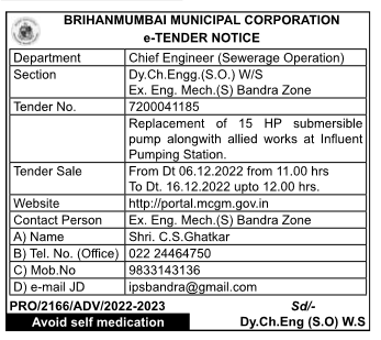 Tender for Replacement of 15 HP submersible pump alongwith allied works at Influent Pumping Station.