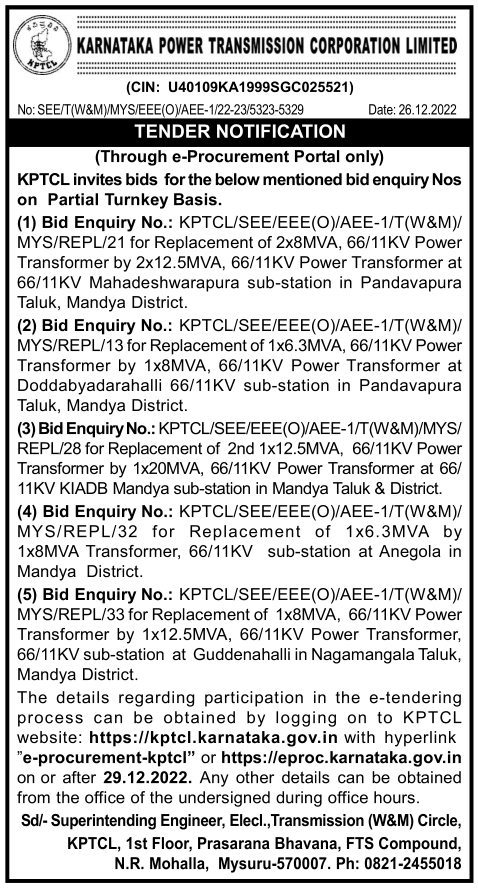 KPTCL/SEE/EEE(O)/AEE-1/T(W&M)/ MYS/REPL/33 for Replacement of 1x8MVA, 66/11KV Power Transformer by 1×12.5MVA, 66/11KV Power Transformer, 66/11KV sub-station at Guddenahalli in Nagamangala Taluk, Mandya District.