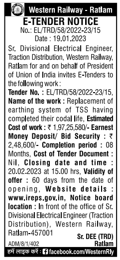 Tender for Replacement of earthing system of TSS having completed their codal life,