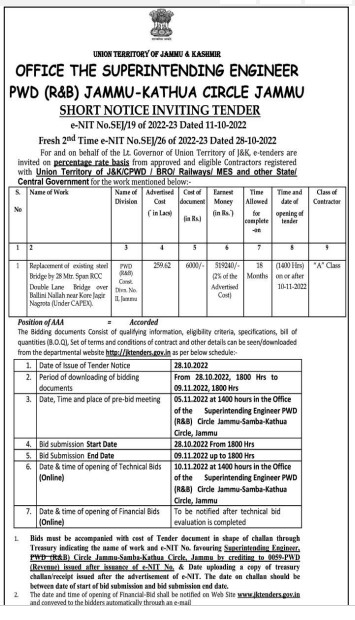 Tender for Replacement of existing steel Bridge by 28 Mtr. Span RCC Double Lane Bridge over Ballini Nallah near Kore Jagir Nagrota (Under CAPEX).