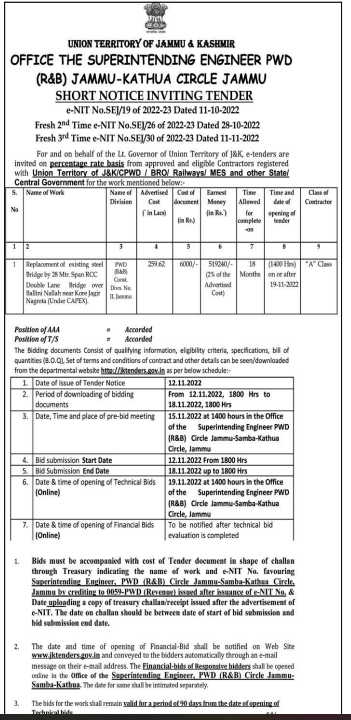 Tender for Replacement of existing steel PWD Bridge by 28 Mtr. Span RCC Double Lane Bridge over Ballini Nallah near Kore Jagir Nagrota (Under CAPEX)
