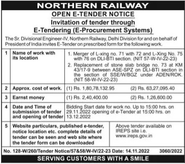 Tender for Replacement of stone slab bridge no. 73 at KM 43/17-9 between ASE-SPZ on DLI-BTI section in the section of SSE/W/BGZ under ADEN/ROK. (NIT 58-W-IV-22-23)