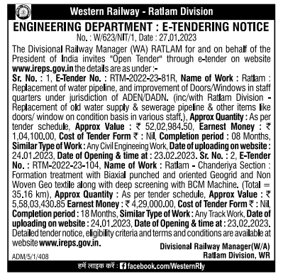 Tender for Replacement of water pipeline, and improvement of Doors/Windows in staff quarters under jurisdiction of ADEN/DADN. (inc/with Ratlam Division Replacement of old water supply & sewerage pipeline & other items like doors/window on condition basis in various staff.),