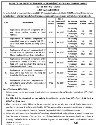Tender for Replacement of wornout components of 63 KVA voltage stabilizer installed at T/well Rathana.