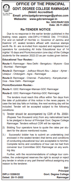 Tender for reputed and registered tour operators for conducting All India Educational tour of 14 nights/ 15 days and Picnic/excursion (one day) of the College students for the session 2022-23 as per routes given below.