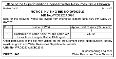 Tender for Restoration of Saran Anicut Village Saran GP Lalas Tehsil Gangrar District Chittorgarh