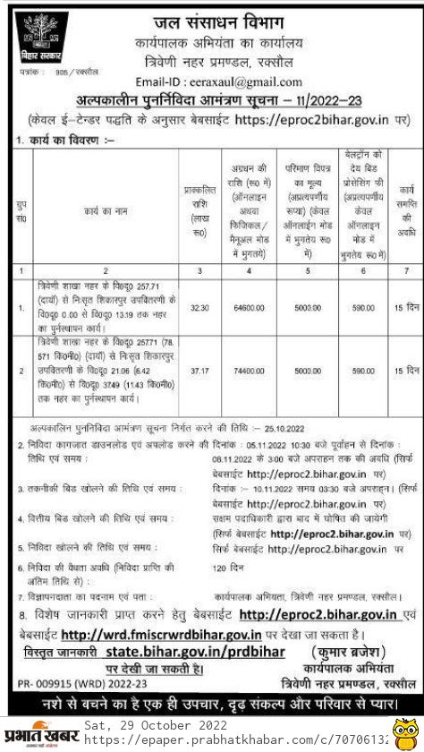 Tender for Restoration work of canal from point 0 257.71 (right) of Triveni branch canal to Shikarpur subdivision point 0 0:00 to 1319