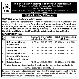 Tender for Retiring Rooms in Indian Railway Catering & Tourism Corporation Ltd