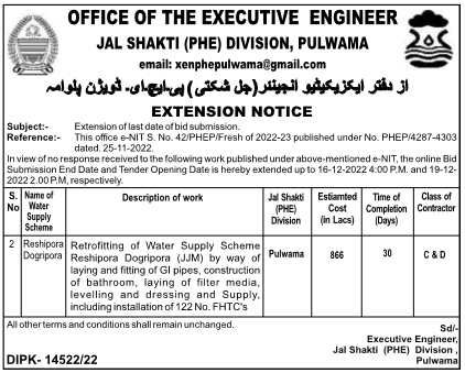 Tender for Retrofitting of Water Supply Scheme Reshipora Dogripora (JJM)