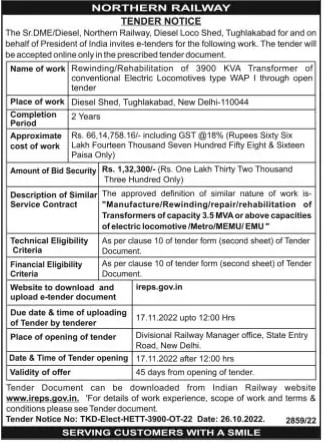 Tender for Rewinding/Rehabilitation of 3900 KVA Transformer of conventional Electric Locomotives type WAP I through open tender