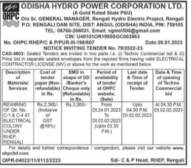 Tender for REWIRING OF Qtr. No. C-1 & C-4 AT ELECTRICAL COLONY UNDER RHEP RENGALI