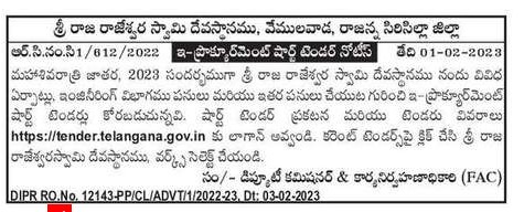 Tender for ri Raja Rajeswara Swamy Devasthanam, Vemulawada, Rajanna Sirisilla District