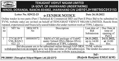 Tender for R&M of C&I package of Unit#2 under Valmet DNA (Metso DNA) platform at TTPS. Lalpania.
