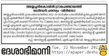 Tender for Road Connectivity Mapping and Renting of Vehicles for Assistant Engineer under the Annual Plan 2022-23 of Ayyapankovil Village Panchayat