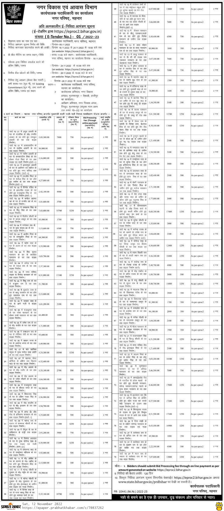 Tender for Road construction from the shop of Mahendra Chaudhary to the house of Mohd Naeem in Ward No. 11.