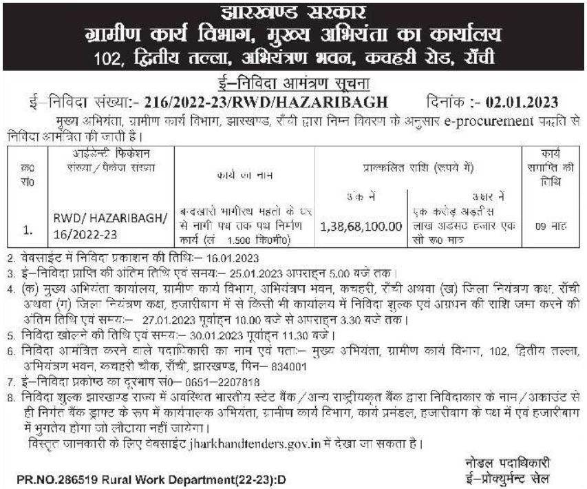 Tender for Road construction work from Badkhari Bhagirath Mahton to Nagi Path (1.500 km long)