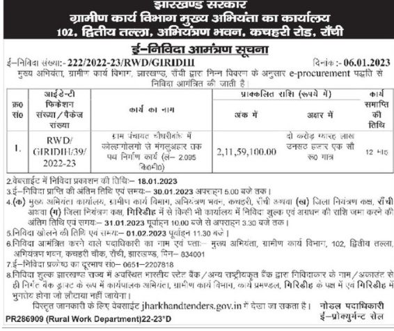 Tender for Road construction work from Kolhagolgo to Mangaluahar in Gram Panchayat Choudharin