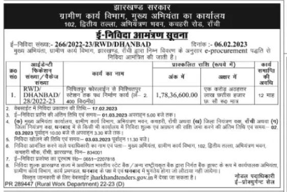E-Tender Number:- 266/2022-23/RWD/DHANBAD Chief Engineer, Rural Works Department, Jharkhand Ranchi invites tender through e-procurement method as per the following details.