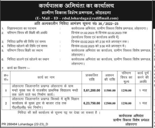 Tender for Road construction work leading from village Manho main road to Government Primary School Manho of Lohardaga block under Lohardaga district.