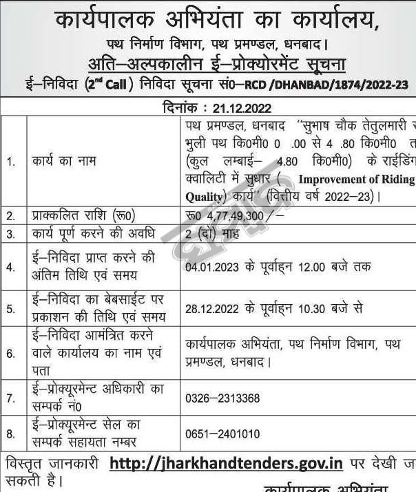Tender for Road Division, Dhanbad “Improvement of Riding Quality work (Financial Year 2022-23) of Subhash Chowk Tetulmari Bhuli Path Km 000 to Km 480 (Total Length- 4.80 Km).