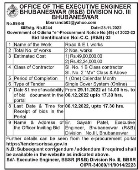 Tender for Road & E.I. works 2 Total No. of works OFFICE OF THE EXECUTIVE ENGINEER BHUBANESWAR (R&B) DIVISION NO. III BHUBANESWAR
