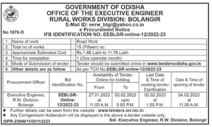 Tender for Road Work in GOVERNMENT OF ODISHA OFFICE OF THE EXECUTIVE ENGINEER RURAL WORKS DIVISION: BOLANGIR