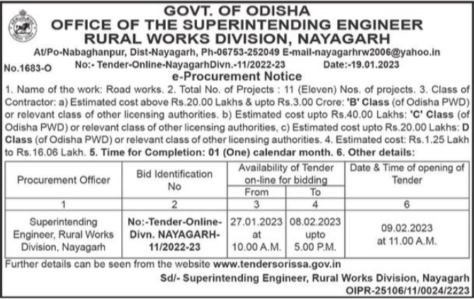 Tender for Road works. 2. Total No. of Projects: 11 (Eleven) Nos. of projects. 3. Class of Contractor