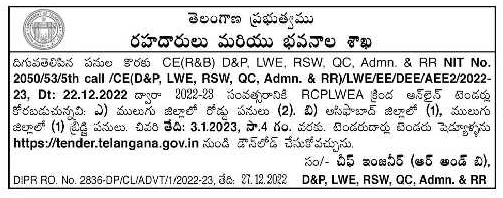 Tender for Road Works in Mulugu District (2). b) Bridge works in Asifabad district (1) and Mulugu district