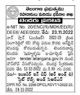 Tender for road works in Sangareddy under Non Plan (MDR) 2022-23.